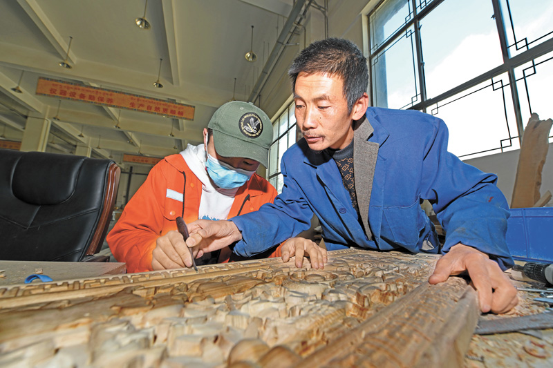 The picture shows students of Lhasa No. 2 Secondary Vocational and Technical School learning to make wood carvings.