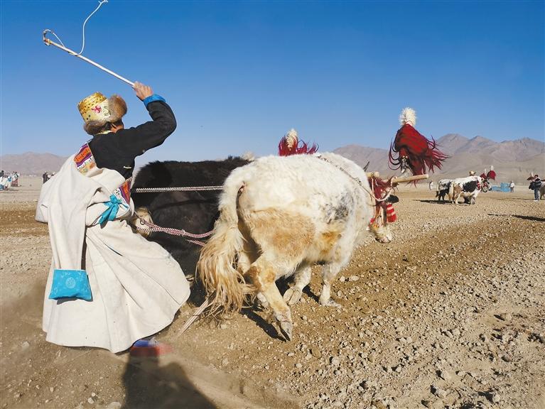 On the spring ploughing ceremony in Lagui Village, Qumei Township, Samdrutse District, the villagers are using large agricultural machinery to plough the land. The villagers are plowing their fields.