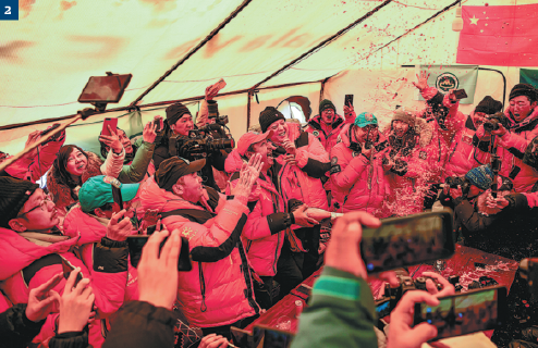 Team members at North Base Camp drink champagne to celebrate the successful ascent. PURBU ZHAXI/XINHUA